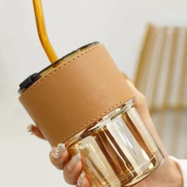 • Slub Glass an Insulated Tumbler with a Closed lid, Straw, and a Protective Anti-Skid Leather Sleeve for hot and Cold Beverages Sipper Mug for Smoothies, Fruit Juice, and Tea